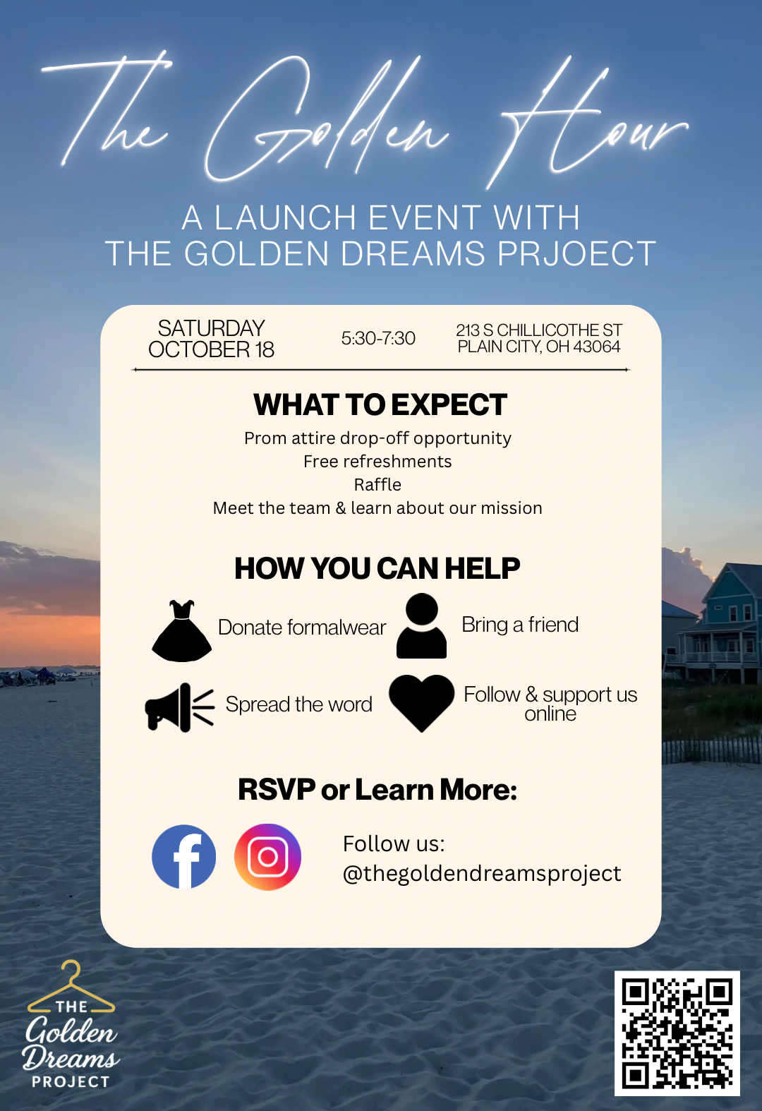 In celebration of the launch of The Golden Dreams Project, we are hosting a community event! The goal of this event, The Golden Hour, is to not only share our mission but also propel that mission forward with a prom attire drive. We’ve all heard of golden hour. Golden hour represents hope, radiance, empowerment, transformation & opportunity. That perfect window of time to grow and flourish while light breaks, creating new beginnings. Here’s how you can be a part of it: